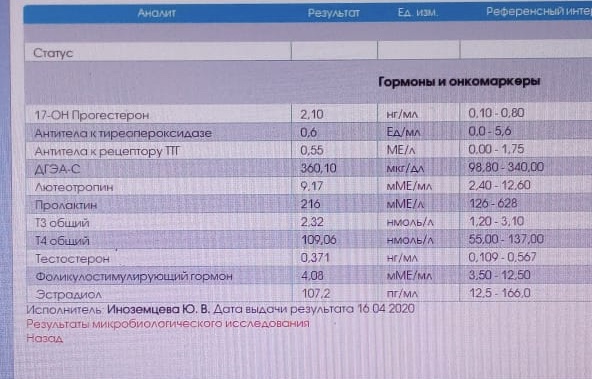 Завышенный 17ОПГ - это результат вызванного прогестероном цикла. До 2нг/мл исключаем ВДКН, а больше он ничего не показывает. При результате в 2.1 я бы потом как-нибудь в спонтанном (без прогестерона) цикле сдала строго на 2-4дц ещё раз, чтобы точно исключить погрешность из-за дюфастона. Странно, что нет ТТГ, это важный анализ для щитовидной. Размеры ЛГ и ФСГ наводят на мысль об ановуляции. Есть, хотя бы, один цикл фолликулометрии?