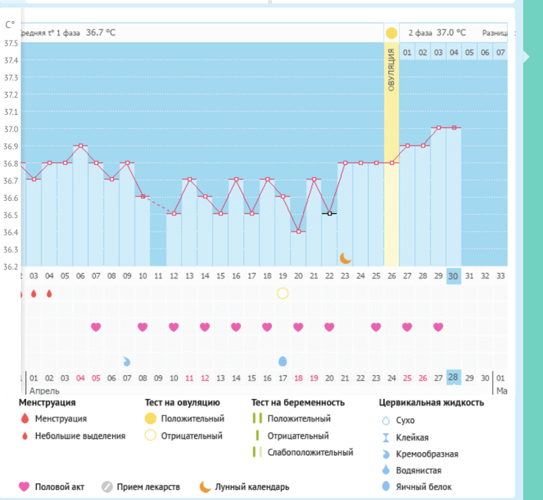 У меня 1 фаза 36,3, вторая фаза 36,7-36,8 , редко выше 36,8 поднимается. Один раз за десятки графиков 37 была) это НОРМАЛЬНО для меня!))