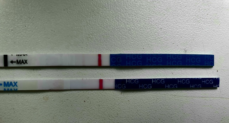 Отлично видно полосочки. На верхнем тесте чуть ярче, но и на нижнем видно. Просто тесты разных фирм, но это и хорошо, видно что есть беременность.