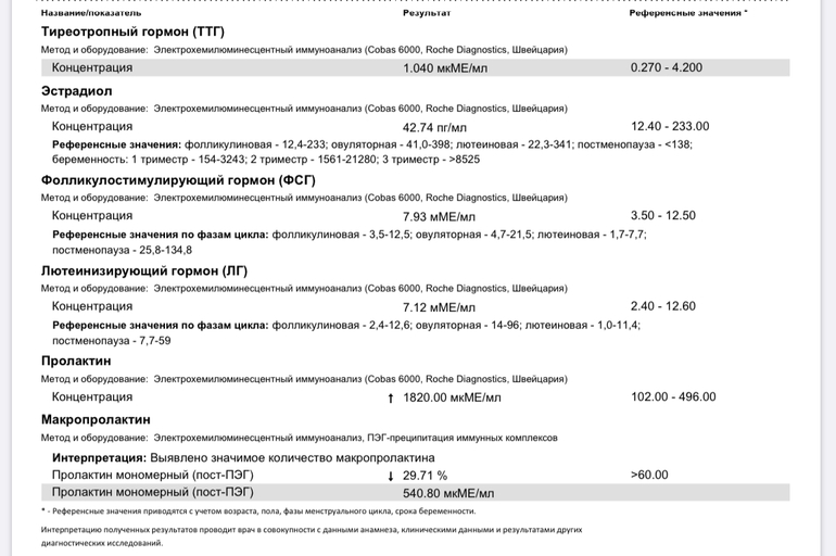 Пролактин очень сложно сдавать. Надо сидеть минимум пол часа перед кабинетом и не нервничать. Если просто пришел и сдал, то будет повышен. Если сдали правильно, то достинекс в помощь. Повышенный Пролактин может блокировать овуляцию. У меня так было.