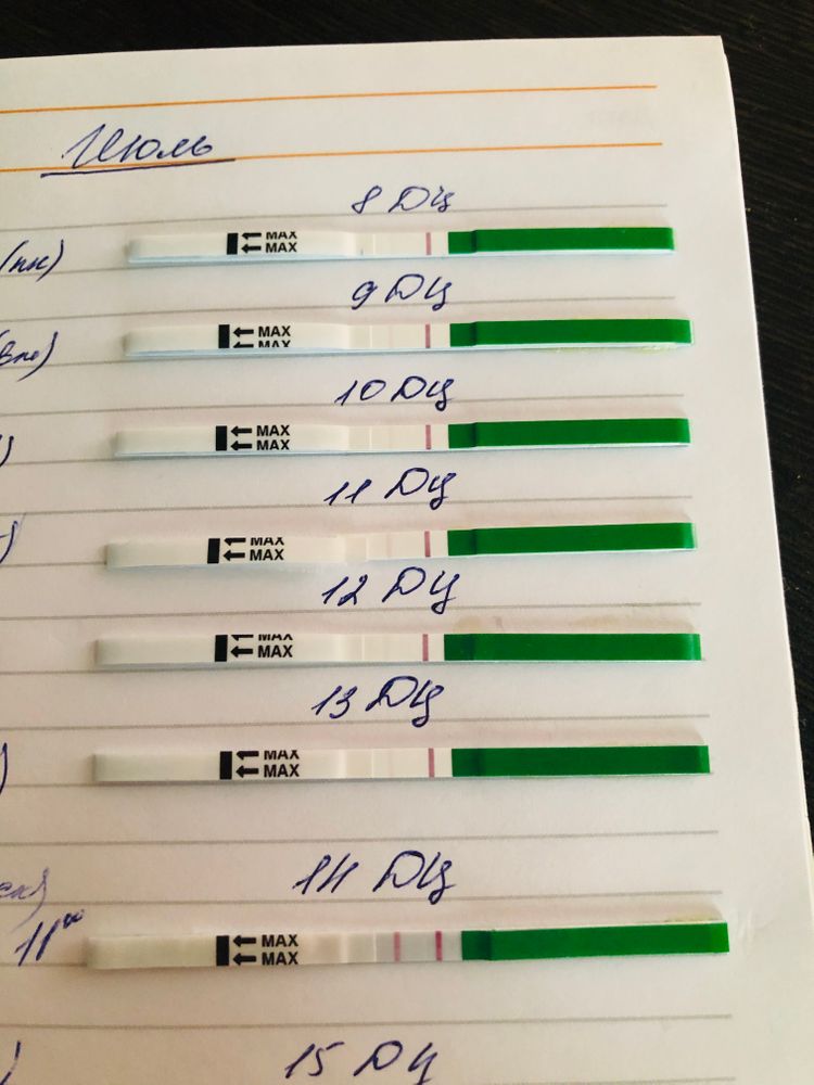 Овуляция( тесты на овуляцию)Девочки! Вы все знаете!!! Подскажите т.к. с тестами на О мало знакома. Была на ФМ на 10 дц все в норме ( за иск.Э но это я знаю), на 13 дц сказали что Ф не готов к О. Я конечно расстроилась что скорее всего опять ановуляция ( так и врач сказала). Но днем сегодня (14дц) сделала тест На О и наконец то из трёх циклов полоска стала ярче. Что скажете?