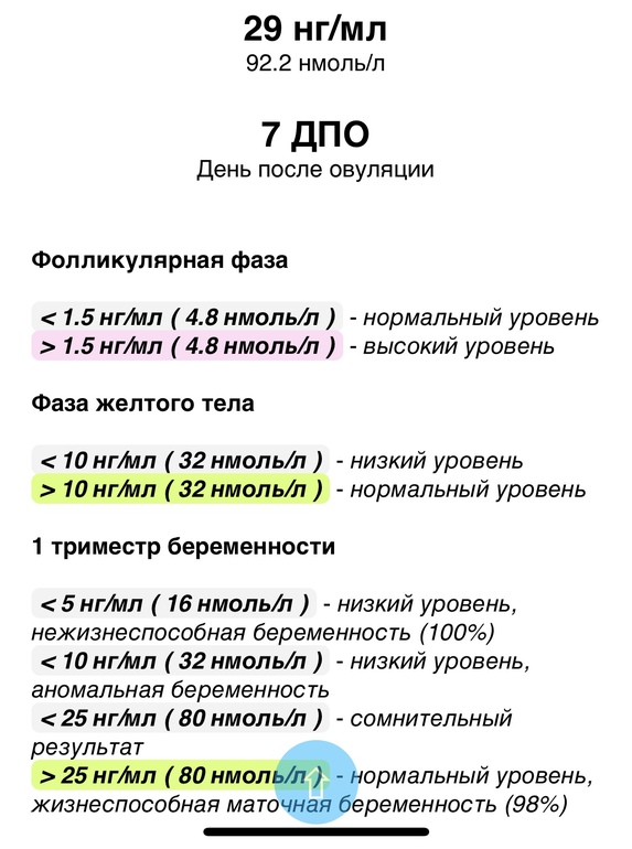 АнализыСдавала на 7 дпо прогестерон, вторая фаза у мен 12 дней. Результат выше нормы, 29,35 нг/мл. Тесты пока отрицательные, 8дпо. С о пекут оба яичника. Может совулироыали оба поэтому большое значение? Или сбой? Или возможна беременность?
