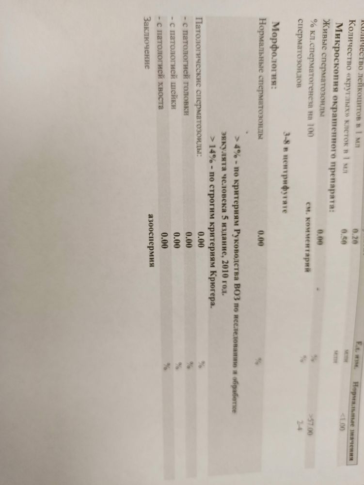 АнализыДевочки ! Крик души ! Муж сдавал спермограмму . Результат - азооспермия ( по нулям) . Решили пересдать, так как доставляли сами, мало ли, не дожили может 🤷 Сегодня ходил непосредственно сдавать уже в лаборатории. В итоге : невозможен расчет . И заключение уже другое . Что значит итог невозможен ??? Всё сдал у них ведь , ничего не носили. Вообще не понимаю я уже