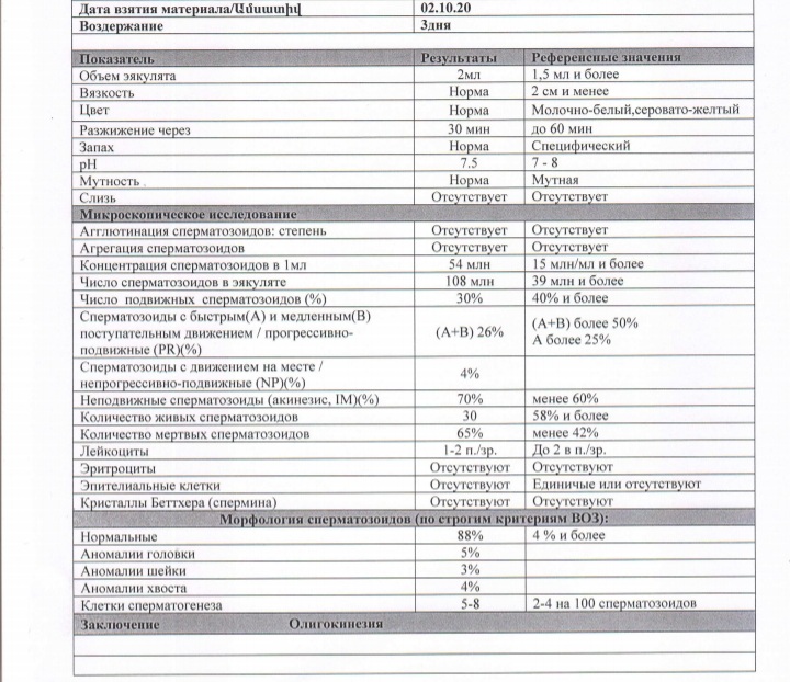 Дело в том что если я покажу вам нашы прошлык наверное вы удивитесь. В первый раз объем эакулята бвл 0.8, ровно через 1 месяц уже 2 Сперматозоидов было 35. млн, через месяц 138 млн, только РН был выше нормы и лейкоциты выше нормы, пересдали в другой лабарвтории тут выложила что получили (провкрили все, простатита нет, варикоцеле нет, бак посев мочи чист) Уже сами запутались