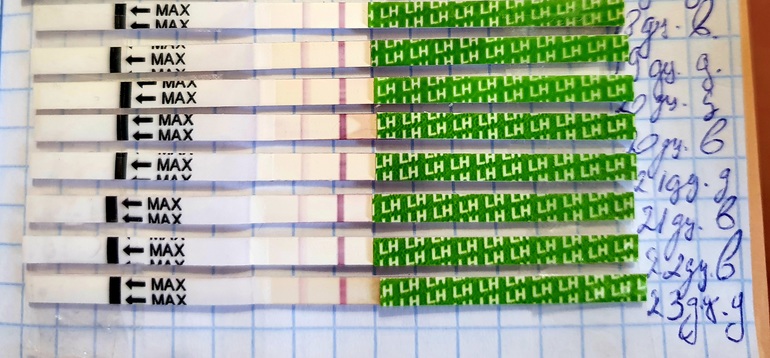 Овуляция( тесты на овуляцию)Я первый раз взяла Фрау и не понимаю,поймала я пик,или нет? Кто не первый раз с Фрау,подскажите,на 20й дц можно считать за пик,или нет? Самый нижний сделан только что