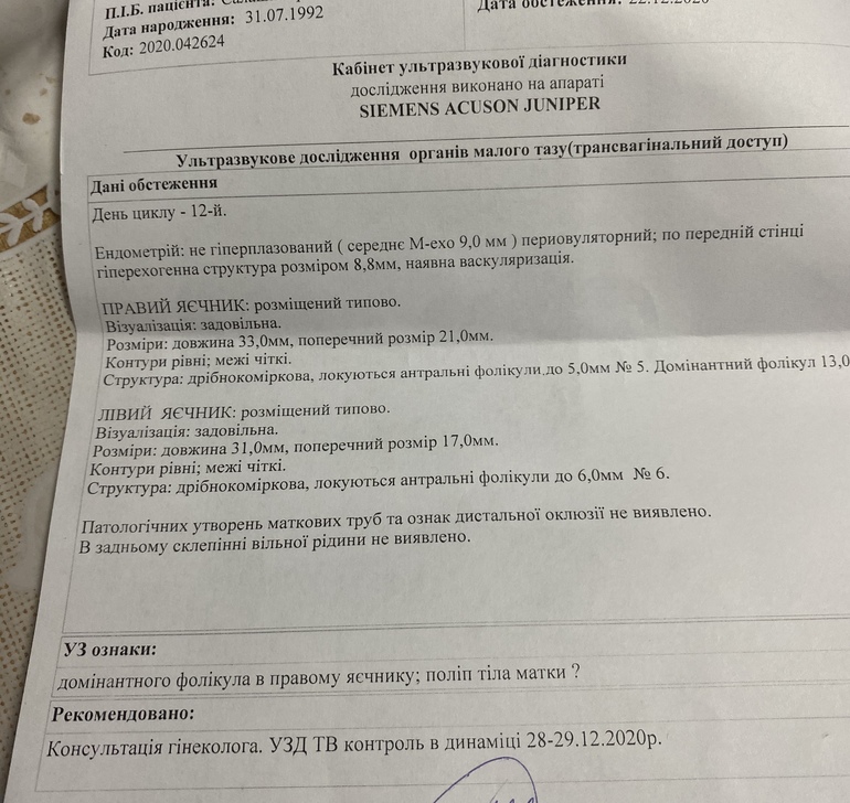Девочки,была сегодня на узи-итог не радует-полип тела матки под вопросом и дф в яичнике 13мм, врач сказала вероятность беременности минимален и возможно нужна будет повторная гистера(уже удаляли полип шейки матки летом)