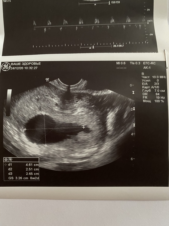 По узи ПЯ (СВД) - 32,6 мм (соотв. сроку 8н 2 дня), а КТР - 4,2 мм (соотв. 6 нед 1 день), сердцебиение определяется