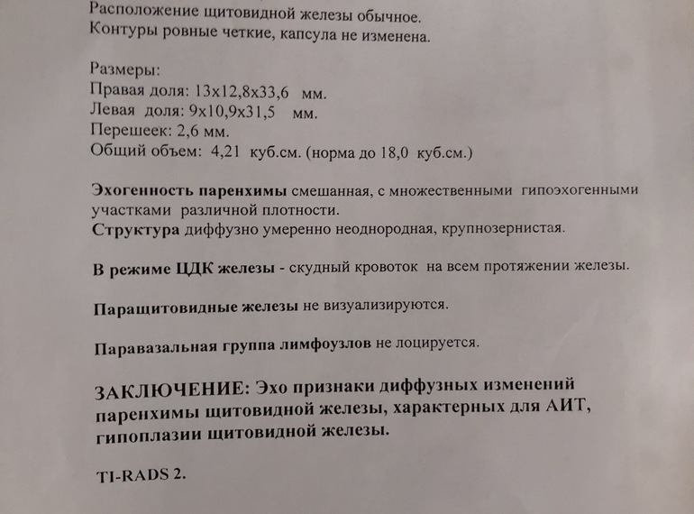 По УЗИ щитовидной мне сказали, что она у меня маленькая и поэтому мало гармонов, ТТГ был 4,8. Поэтому не могла забеременеть. Поставили гипотериоз аит. Была зб. Скорее всего щитовидка не справилась с нагрузкой, теперь на гармонах, пью л-тироксин 75 и жду лялечку. Эндокринолог сказала что все будет хорошо, если контролировать. ТТГ снизился до 1.4