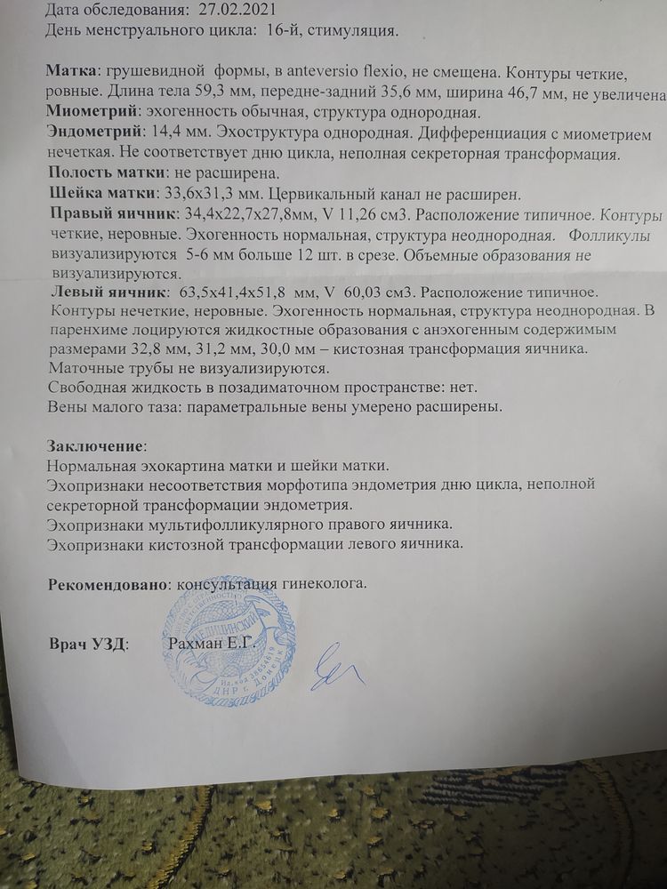 Привет девочки. Пишу и плачу... 16 ДЦ, стимуляция Летрозолом. На 12 ДЦ был укол ХГЧ 10 тысяч при размерах ДФ 20 мм и 21,5 мм. Сегодня на УЗИ ходила, чтобы подтвердить О. Итог: выросло три кисты 32,8 мм, 31,2 мм, 30 мм. УЗИ прикрепила. Почему ДФ не лопнули?! Сижу реву, настроения нет вообще. Надежды никакой. Все как и в прошлом цикле на Клостилбегите. Ре посчитала, что он мне не подошёл и поэтому назначила Летрозол. Но все равно ситуация повторилась. Короче я не знаю. Гормоны в норме, УЗИ типа тоже, только МФЯ и всё. Свои О очень редкий гость. Короче жду М и возвращаюсь на ОК до лета, пусть мои яичники отдохнут, да и психоэмоциональное состояние наладится заодно. Я устала от этих безконечных УЗИ, таблеток,тестов... Вобщем всё.