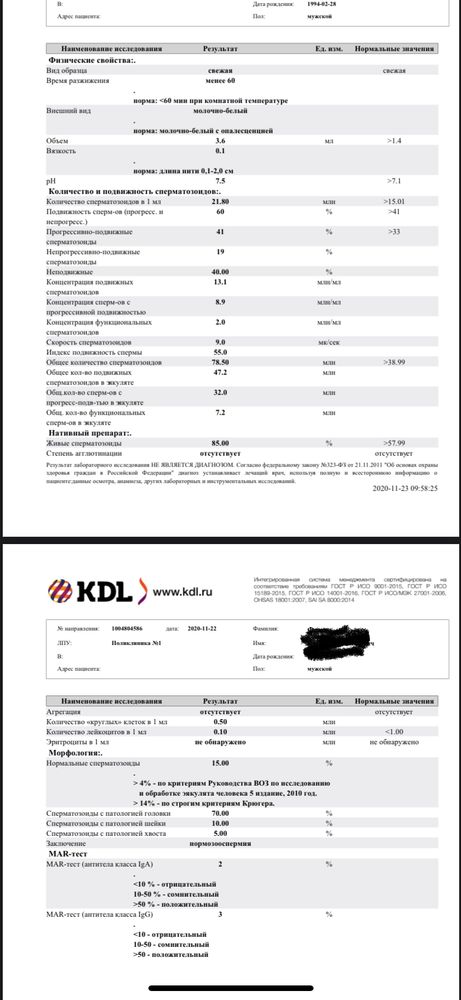 Мой вам совет, в следующий раз не сдавайте в KDL спермограмму, там смотрит анализатор, что не дает гарантий точности. Мы по незнанию тоже сдавали в сетевой лабе, морфология была просто прелесть, андролог отправил пересдавать туда, где смотрит сперму эмбриолог, вот тут то мы и увидели разницу сразу, морфология по Крюгеру оказалась 3%.