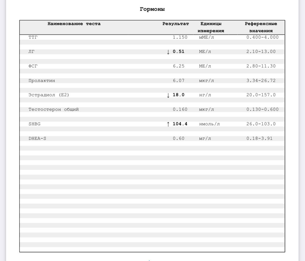 АнализыДевочки привет! Вчера был 4 день цикла, решила сдать проверить гормоны, а то последний раз сдавала 1,5 года назад...все было хорошо.. и вот собственно результат!Помогите разобраться? Я так понимаю ЛГ сильно низкий? или это нормально для 4 дня цикла? Бежать к гинекологу? или пересдать еще раз? Если пересдать это опять ждать весь цикл? Заранее благодарю за ответы!