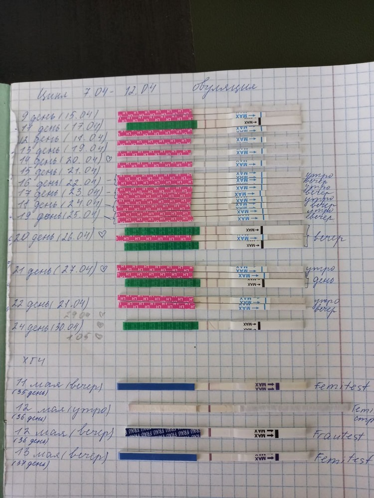Овуляция( тесты на овуляцию)Веду дневник овуляции, не совсем понятно с овуляцией в этом цикле. Обычно цикл длинный, около 40 дней. КД начались 07.04.2025. Овуляция как мне кажется была 26.04.2025 (20 день цикла). Может быть цикл без овуляции, не была на узи.