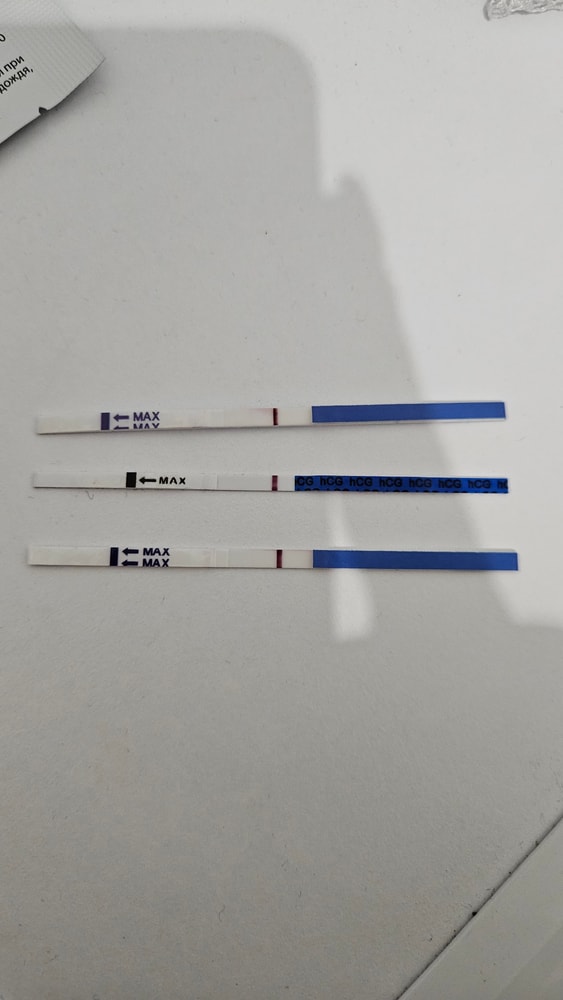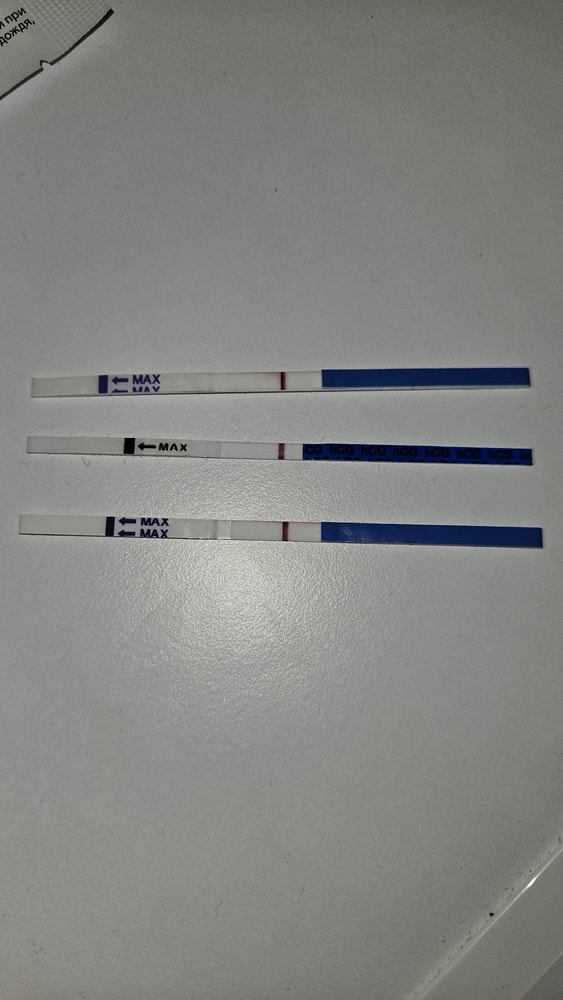 Сегодня 30дц. Вечером решила в очередной раз сделать тест. Начала с феми (верхний, 10мМе) и он выдал слабую полосочку. Мне показалось, что он бракованный, повторила на бона менте (посередине, 25мМе) и еще одном феми (нижний). Теперь не понимаю, есть на них что-то или нет. Вы видите?
