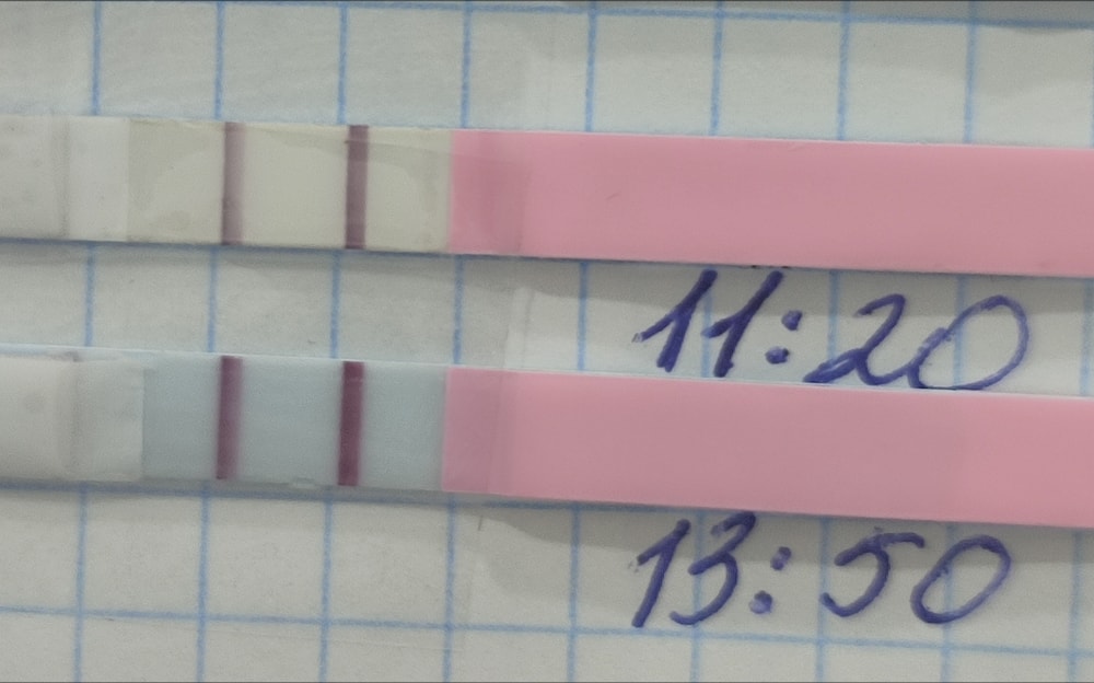 Мама_Кошка, на нижнем и контрольная темнее, так что сложно сказать. Тем более, что тесты -это не точно, в том плане, что количество реагента изначально может быть разным, потому даже на одну мочу могут немного отличаться. В любом случае еще не одинаковые, так что ждите еще немного😊а я бы советовала даже после однозначно положительного продолжать. Во вторую б у меня тестовая была ярче всего несколько часов днем, а в третью 4 дня была жирнее и ярче контрольной, а овуляция была аж на 5 день. Спасибо моей неадекватной страсти ко всем тестам и тому, что чувствую о, что я продолжила делать делать, иначе бы могли не дотянуть до самой о