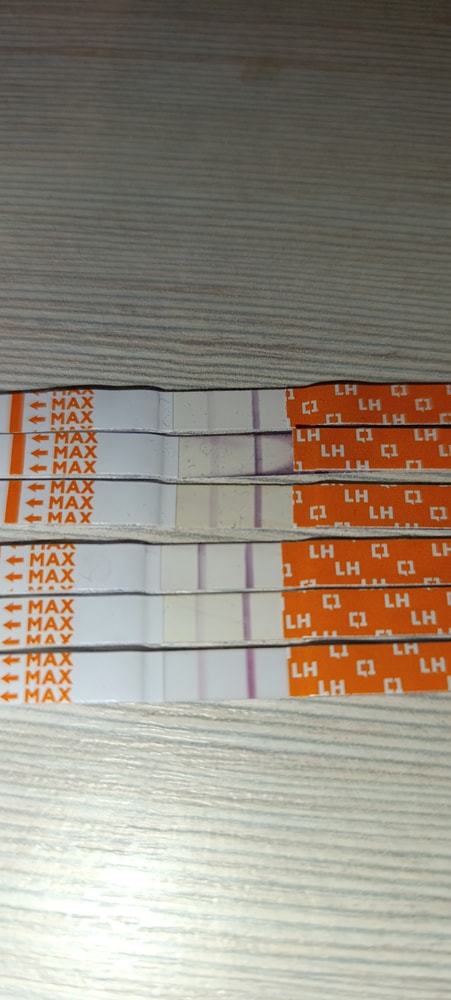 Овуляция( тесты на овуляцию)Что-то я не пойму. Первый раз занялась тестами на ЛГ. Нижние 2 сегодня делала, днём и последний сейчас. Самый яркий вчера в районе 20 часов. Остальные верхние соответственно по одному в день. Самый яркий не сравнялся всё же с контрольной, приложение фемометр отмечает его как отрицательный (61%). Что это получается, вот она зрела-зрела и в итоге передумала? Ощущений овуляторных особо я сегодня не испытываю, вчера и подавно. По всем приложениям сегодня овуляция, я в растерянности...