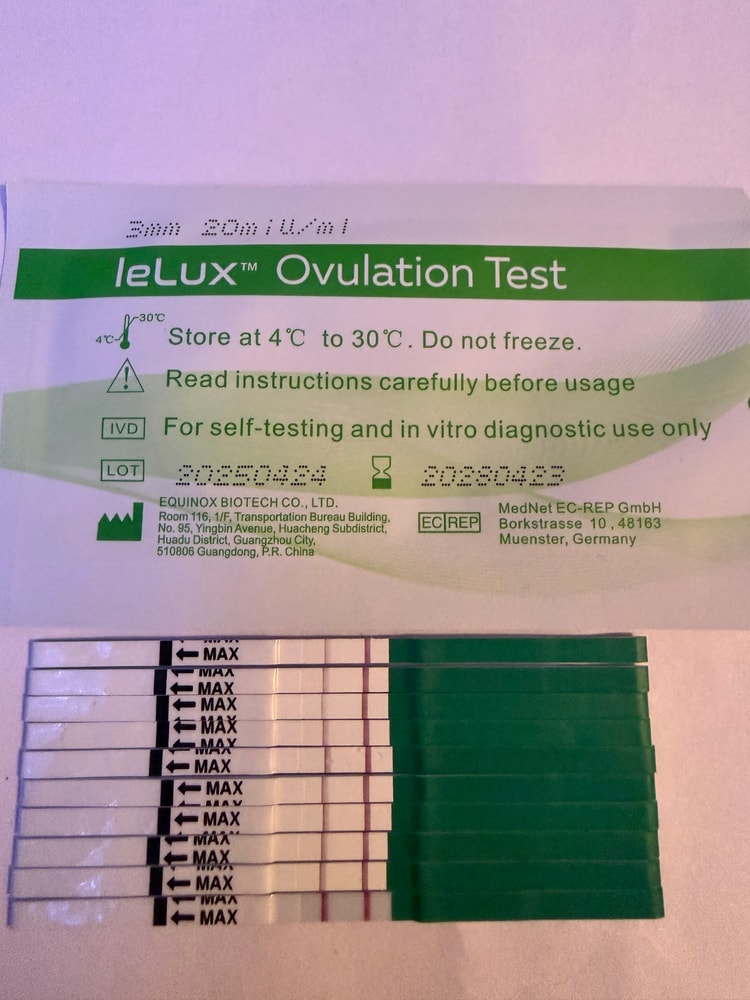Искала на вб тесты на овуляцию и нашла 😉 дешево и сердито 25 штук 200 рублей. Называются lelux. Четенько показали пик утром, хотя правый яичник болел вчера и тест был почти положительный. Последние 4 вчера за вечер,5 нижний утро.Думала что пропущу пик, но нет в 10 утра четко показал две жирненькие. Жаль что Муж приедет в отпуск только через две недели…и должен начаться цикл. Грустно пропускать такие моменты .Но он приедет на 17 дней вдруг мне повезет в следующем цикле ❤️🙏 и моя мечта исполнится✊ овуляция должна быть прям на Рождество 🎄