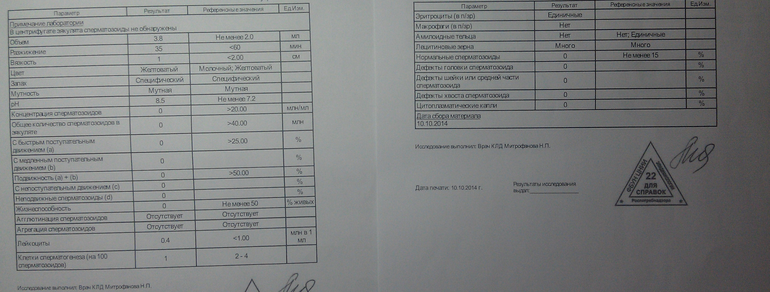 Прошло три месяца надежд, в каждом цикле ждали чуда, но ничего не произошло. В повторной спермограмме по прежнему 0, но увеличился объем, и присутствует клетки сперматогенеза как и в перном случае, но также появились единицные эритроциты. Сходили на приме к урологу в МОНИКИ. Врач посмотрел анализы, произвел осмотр. Сказал, все в норме, гормоны отличные. Причину болезни он не знает и посоветовал обратиться к репродуктологу делать биопсию.