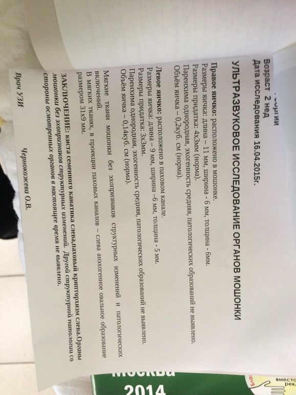 Родились с одним яичком, в две недели делали УЗИ. Его нашли в паховом канале, размер хороший, но нашли и кисту семенного канатика. Хирург говорил, что она не даст яичку опуститься, думайте об операции. Сейчас нам 4,5 месяца, я яичко так и не опустилось. Я напросилась на второе УЗИ. К хирургу скоро, да и волнуюсь как оно все там... Сделали второе УЗИ и ничего не нашли! Ни кисты, ни яичка. Эндокринолог сказала, что киста могла рассосаться. А яичко? Ушло в брюшную полость? Может яичко гулять туда-сюда? Могла его узистка не увидеть? Эндокринолог также сказала, что при кисте яичко лучше видно.