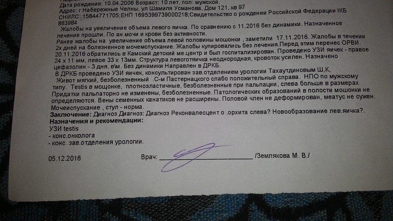 Здравствуйте ! У ребенка увидела что яичко припухло ,привезла в больницу . У ребенка ничего не болит .врач положил в больницу .через 3 дня вызвал меня и сказал ,что возможно опухоль яичко направил в Казань .В Казани опухоль не подтвердили и сказали что это может быть ,т.к ничего не болит легкий орхит после Ротовирусной инфекции . Через неделю еще раз приехать показаться .не знаю что и думать .скажите пожалуйста при легком орхите может такое быть чтобы ничего не болели и и через сколько опухоль должна пройти при орхите .? Вот наши обследования .![]()