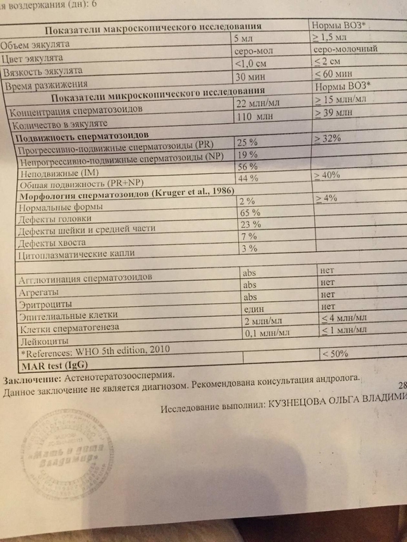 История у нас такая, мы с мужем в браке 12 лет, и в этом браке было 2 беременности, одна 12 лет назад, но она закончилась выкидышем на 5 неделе и вторая 11 лет назад, которая закончилась родами, тоесть у на один ребенок есть, сейчас планируем второго, планируем уже около двух лет, себя конечно же обследовала в первую очередь, женский фактор исключен, после себя занялись мужем, последние две спермограммы делали в клиниках, спец. на ЭКО, ходили на консультацию с урологом, но тот сказал что все у него отлично, потом пошли к андрологу, который назначил, анализы, которые я предоставлю, сделал узи! и все- как бы все в норме, назначил профертил на 3 месяца и здоровый образ жизни, и велел через пару месяцев еще раз сдать спермограмму! Вот я и пытаюсь выяснить, так как считаю что показатели обеих спермограмм очень плохие! анализы прилагаю, это гормоны, предпоследняя спермограмма, мазок на ПЦР,и посев
