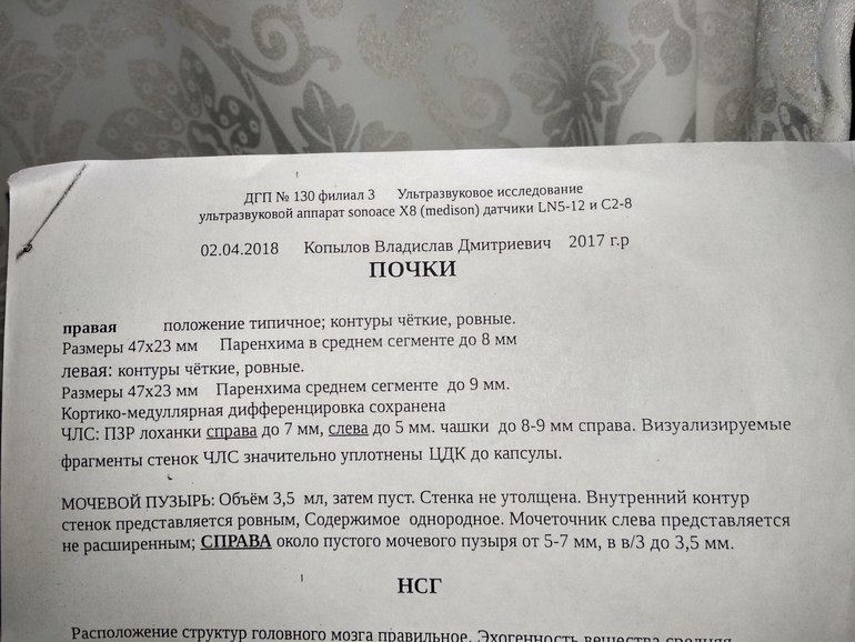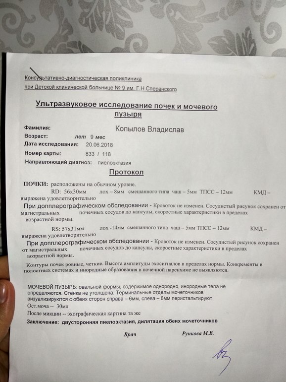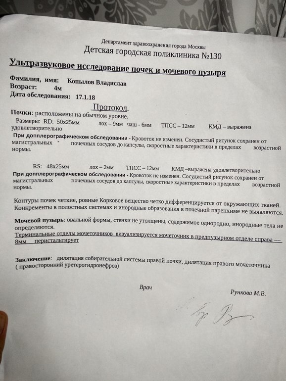 В 1мес расширение мочеточника УЗИ не показало, узист сказала почки недозрелые, переделайте через пару месяцев . В 4 мес уже расширен, после сдали ОАМ лейкоциты превышены и бактерий много через день перездали и стало ещё хуже - лейкоциты сплошь и белок 0,15, температура не повышалась выше 37,2, отправили на госпитализацию в Филатовскую кололи антибиотик. После пили фурагин 2 месяца и просто наблюдались( анализы мочи в норме) УЗИ в 6мес и в 9. Фото УЗИ прилагаю