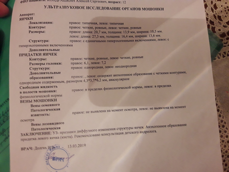 Здравствуйте.сделали узи мошенки мальчику 12 лет.показало диффузные изменения паренхимы яичек.фото прикрепляю(делали 2раза,в разных медцентрах).Подскажите,что это значит.опасаюсь самого страшного.К детскому хирургу попадем только через 3 дня,к андрологу через 4.помогите хоть немного прояснить ситуацию.(изначально обратились к урологу с проблемой задержка мочейспускания-чтобы помочиться ждет некоторое время...)спасибо.