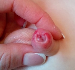 Здравствуйте! Были на плановом осмотре у хирурга в месяц. Она сказала каждый день во время купания немного опускать крайнюю плоть и мыть. Я так делала всегда. Вчера вечером я опустила чуть больше обычного, сильно не тянула, показалась головка. Помыла. После этого увидела трещинку и немного крови. Обработала хлоргексидином и помазала декспантенолом. Утром решила ещё раз обработать, совсем немного натянула крайнюю плоть и там, такое чувство, что содрана кожа по кругу. Фото с интернета, но картина состояния такая же. В состоянии покоя кончик красный и вроде немного припух. Скажите пожалуйста, можно ли самой как-то помочь, нужно ли обрабатывать и чем? Либо идти к врачу? Спасибо.