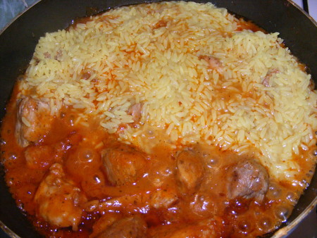 Сверху на мясо выкладываем рис, отваренный до полуготовности (при варке я добавляю карри), заливаем водой (стакан воды) и тушим 30-40 минут. Приятного аппетита!