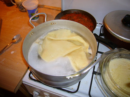 1. Тесто. Просеянную муку насыпать на стол в виде горки, сделать в ней углубление, положить соль и яйца. Замесить тесто. Поставить в теплое место на 20 минут. Разделить на 9 частей. Каждую часть раскатать на тонкие листы. Варить в подсоленной воде 10-15 минут.