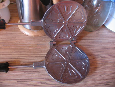 Какая прелесть!Это для приготовления песочного печенья!У меня такая же была(от бабушки досталась,только после переезда не знаю теперь где она).От неё инструкция должна быть и в ней рецепт теста.Обалденно вкусно!Я поищу,может бумажка осталось у меня в тетрадке с рецептами.Готовить очень быстро и удобно.Прямо на комфорке плиты.