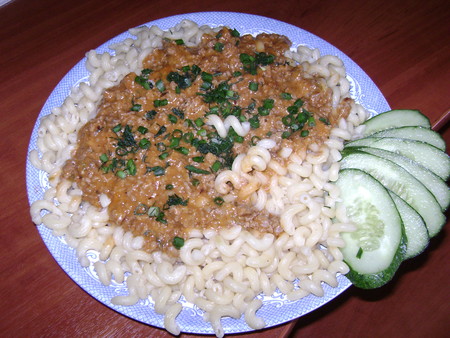 обжарить фарш добавить т|ома|тн|ую пасту немного муки,и потушить,чеснок сливокна готовые макароны выложить на фарш|