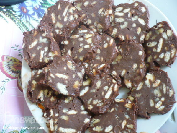 покрошить печеньки на маленькие кусочки, орехи в блендери розмолоть тоже на кусочки, приготовить глазурь, я все делала на глаз, вылить в печенье и хорошо перемешать, вылить массу на фольгу, завернуть пищевой пленкой , сформировать колбаску и убрать на ночь в морозилку( если убрать в холодильник то она не примет форму и плохо застынет). Приятного чаепития!!!