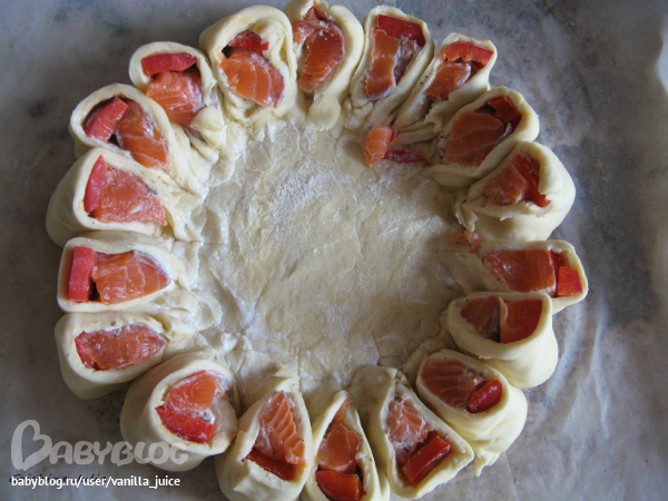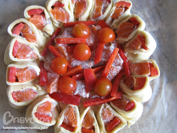 Выкладываем начинку. У меня - 500 гр филе семги, красный сладкий перец.Рыбу выкладываем не всю, а 2/3.