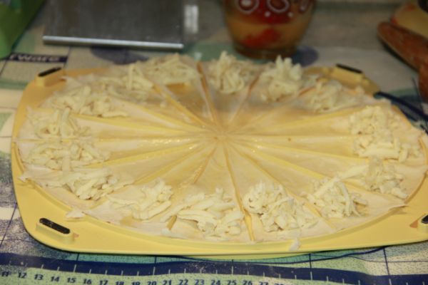 Беру размороженное (покупное) тесто, раскатываю, на досочке прорезаю треугольники. Смазываю водичкой или яйцом тесто, чтобы склеилось потом, и кладу начинку (в данном случае сулугуни).