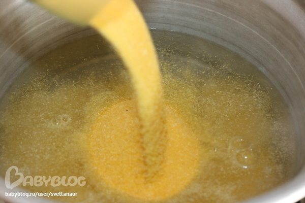 1. В кастрюлю налейте 1 л. воды, подсолите и доведите по кипения. Кукурузную крупу всыпьте в кастрюлю, постоянно помешивая деревянной лопаткой, чтобы не образовались комочки: