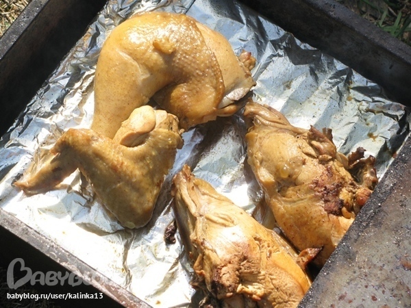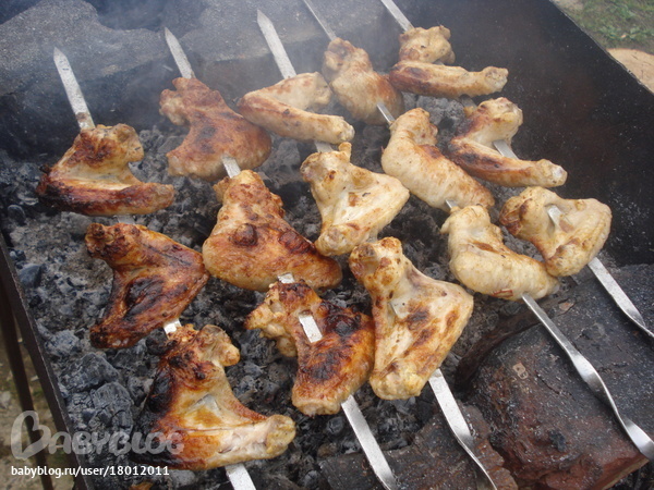Шашлыки и блюда на грилеНу вот и мы открыли шашлычный сезон! Правда погода была какая то......сначала дикая жара 26 град.,а потом поднялся какой то ветер не очень приятный,стало довольно прохладно--около 13 град. А мы все раздетые,хорошо,что малой взяла тёплую кофточку и то в последний момент. Ну да вернёмся к крылышкам! Их лучше взять охлаждённые,обрезать цыпки(пальцы) если таковые имеются--их съест кошка. Маринуем----майонез,горчица,приправа,соль,чеснок и перец чили. Оставляем при комнатной темп. на неск. часов. Жарим!