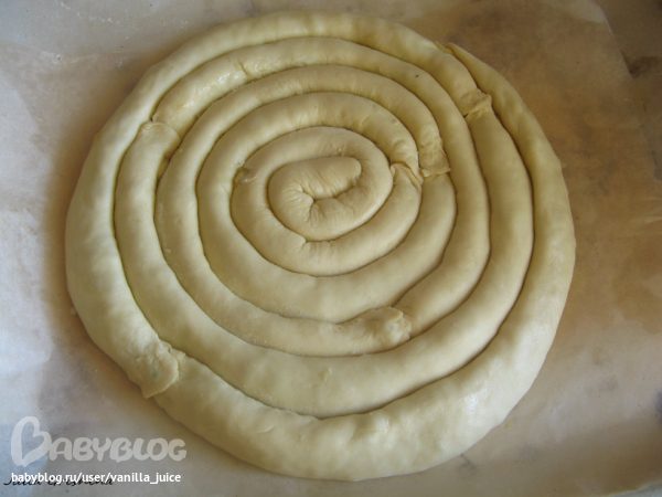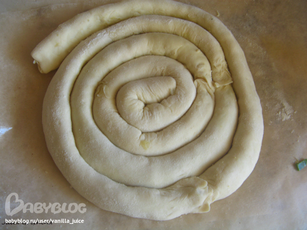 Противень закрываем пергаментом, немного смазываем маслом и начинаем выкладывать пирог. Чередуйте заготовки с начинкой. Я начала с капустной. Далее - лук с яйцом. Потом снова - капуста. Выкладывать нужно швом вниз.