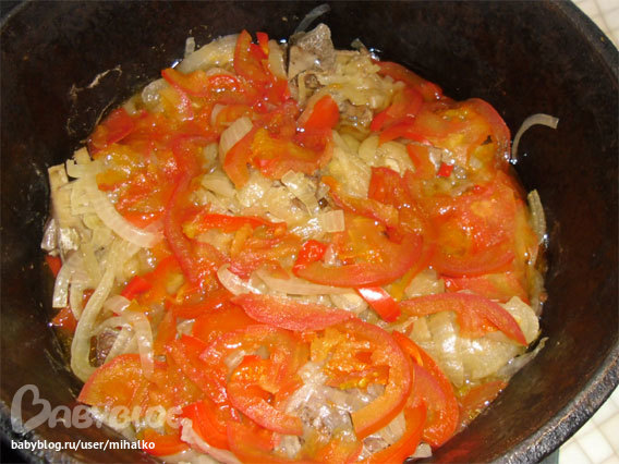 В казан или просто в кастрюлю выкладываем продукты слоями в следующем порядке: лук, паприка, помидоры, баранина, соль, перец, специи.