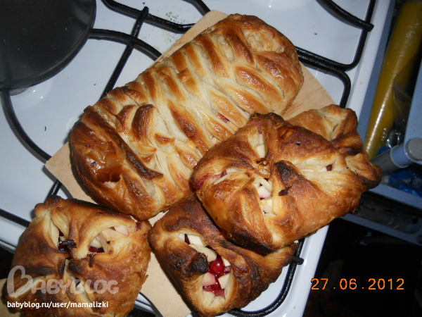 сделала небольшие конвертики с ягодами(дома есть замороженная клюква,посыпала сахаром и с верху яблочко)