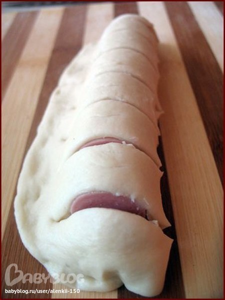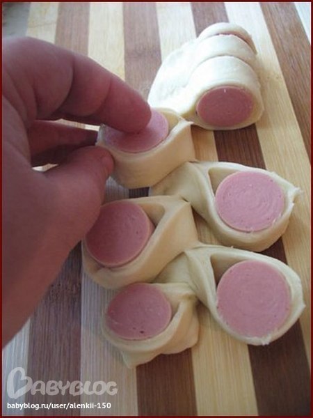 Свернуть как вареник и залепить края, плотно прижимая сосиску к тесту.
