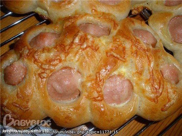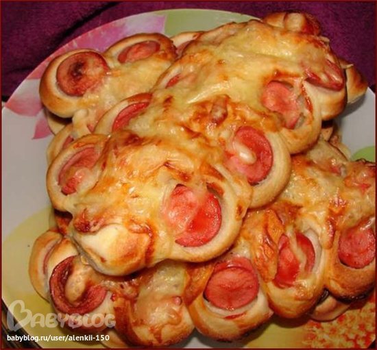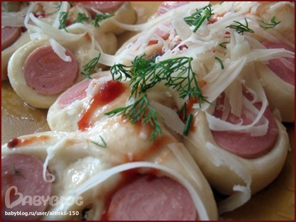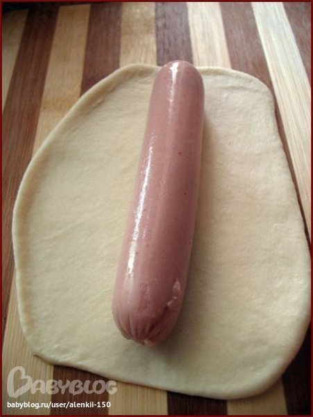 Каждый шарик раскатать в лепешку и положить очищенную сосиску.