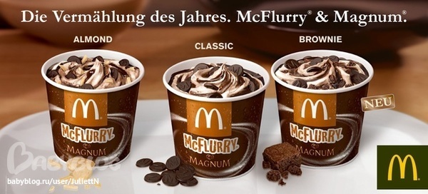 а макфлурри из макдоналдса с даймом, это вообще атас, ела бы его вместо первого и второго, короче я морожно ман, макфлурри во всех странах разные виды так много, дайм с чили перцем, манго, суффели,орео, магнум, аэро с мятой, можно безконечно продолжать, тоблероне, тирамису,с черной смородиной, галакси, роло, рисес, а у нас ограниченный выбор