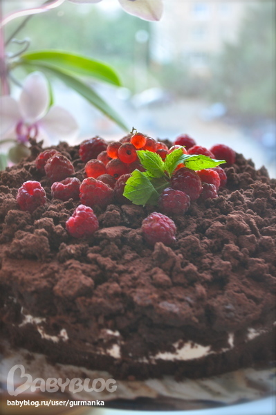У меня остался сметанный крем от другого торта, выбросить было жалко, я его разрезала и промазала слоем крема,но это совершенно необязательно.Обрезала края и раскрошила на торт,припылила немного какао и украсила ягодами.