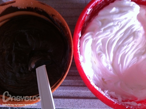 Взбить белки с лимонным соком до крутых пик.Осторожно ввести белки в шоколадную массу.