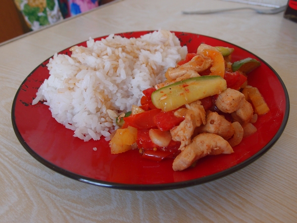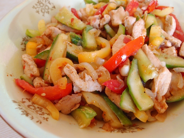Огурцы помыть, если сильно твердая кожица, почистить и нарезать небольшими брусочками. Посолить и оставить на 40 минут. Пока огурцы просаливаются, мясо нарезать небольшими брусочками и обжарить на растительном масле до белого цвета. Затем добавить нашинкованный лук, измельченные 3 дольки чеснока и 2-3 минуты протушить. Затем добавить болгарский перец и помидоры, нарезанные небольшими ломтиками. Добавить 4 ст.л. соевого соуса, перемешать и еще потушить минут 5. Мясо должно быть готовым, а овощи немного хрустеть.