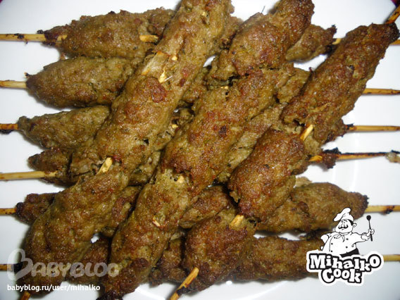 Насаживаем фарш на бамбуковые шпажки и кладем на притивень.