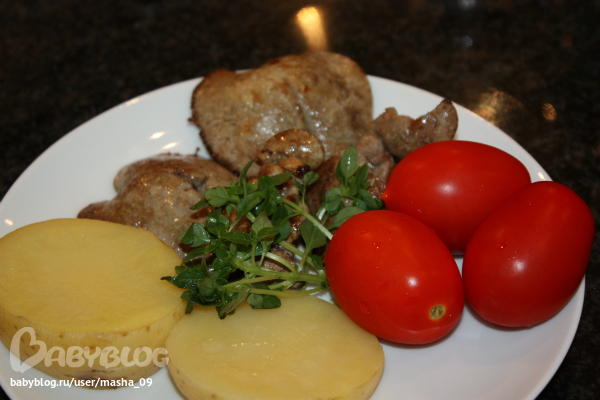 примечателен он своим белковым компонентом. картошечки всего 2 колечка и те на пару приготовлены за 5 минут. т о картофае не разварен до состояния белой булочки. ))))) и помидорки для вкуса) с солью только печенка, углеводы не соленые.