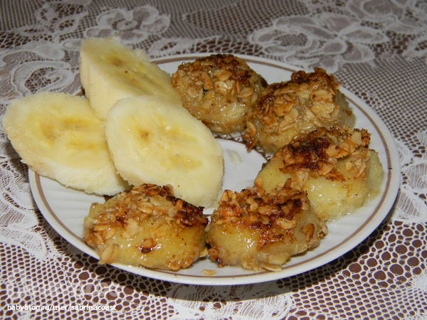 Берем очень мягкие бананы, режем кольцами примерно толщиной в 2 см., затем обваливаем в овсянке ( немного измельчила в блендере) и жарим на сливочном масле с добавлением оливкого (можно и без него).