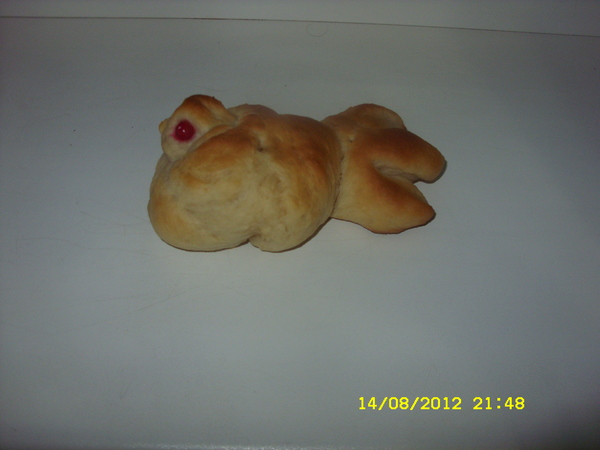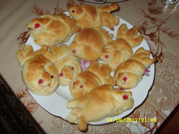 Воду смешайте с дрожжами, добавьте сахар (для несладкого теста добавляйте 0,5 чайных ложек сахара), два стакана муки. Дайте опаре подойти в теплом месте. Затем добавьте остальные ингредиенты и замесите тесто, как обычное дрожжевое. Поставьте его в теплое место. Когда поднимется, обомните, когда поднимется второй раз, обомните снова и сформируйте булочки, стараясь придать форму птичек. Затем дайте им подняться. А уж потом выпекайте в разогретой духовке до готовности при 180-200 *