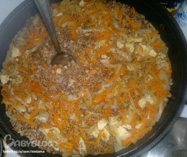 все как обычно - у меня сегодня грудка куриная, обжарила, лук много, морковь тоже не жалею, специи для плова, жарим мин. 15, далее вода и сама гречка, так, чтоб на 2 см бульон был выше крупы, тушить на медленном огоньке минут 30.соль по вкусу
